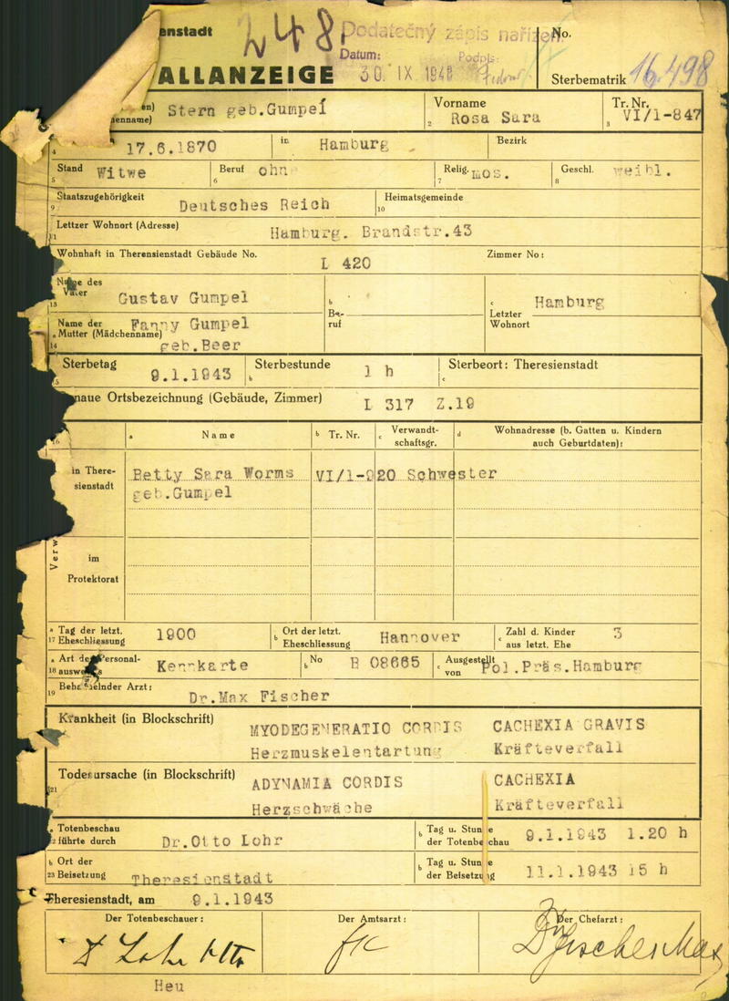 Stern Rosa: Oznámení o úmrtí, ghetto Terezín
