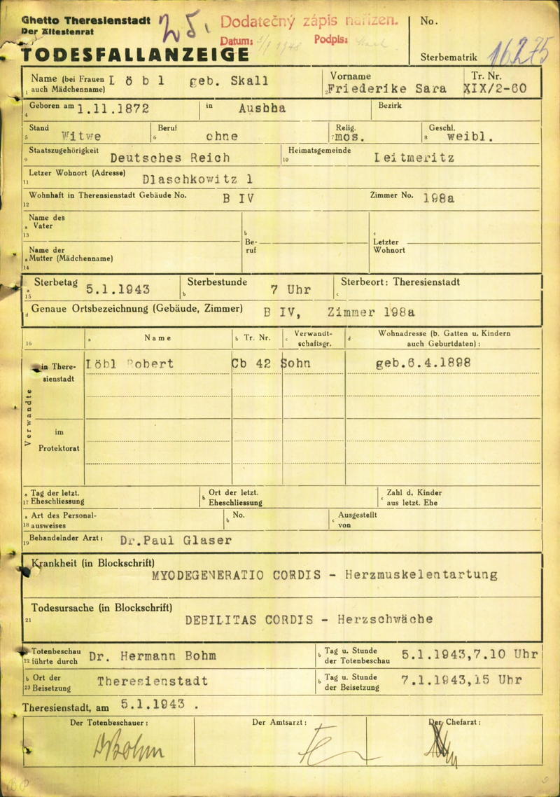 Löblová Friederike: Oznámení o úmrtí, ghetto Terezín