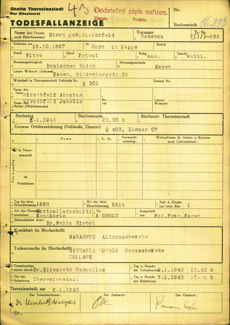 Stern Rebecka: Oznámení o úmrtí, ghetto Terezín
