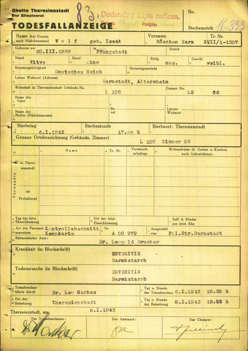 Wolf Rosa: Oznámení o úmrtí, ghetto Terezín
