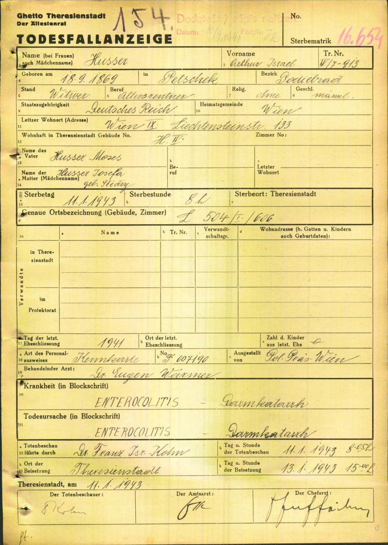 Husser Artur: Oznámení o úmrtí, ghetto Terezín