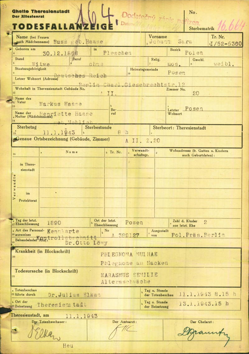 Buss Johanna: Oznámení o úmrtí, ghetto Terezín