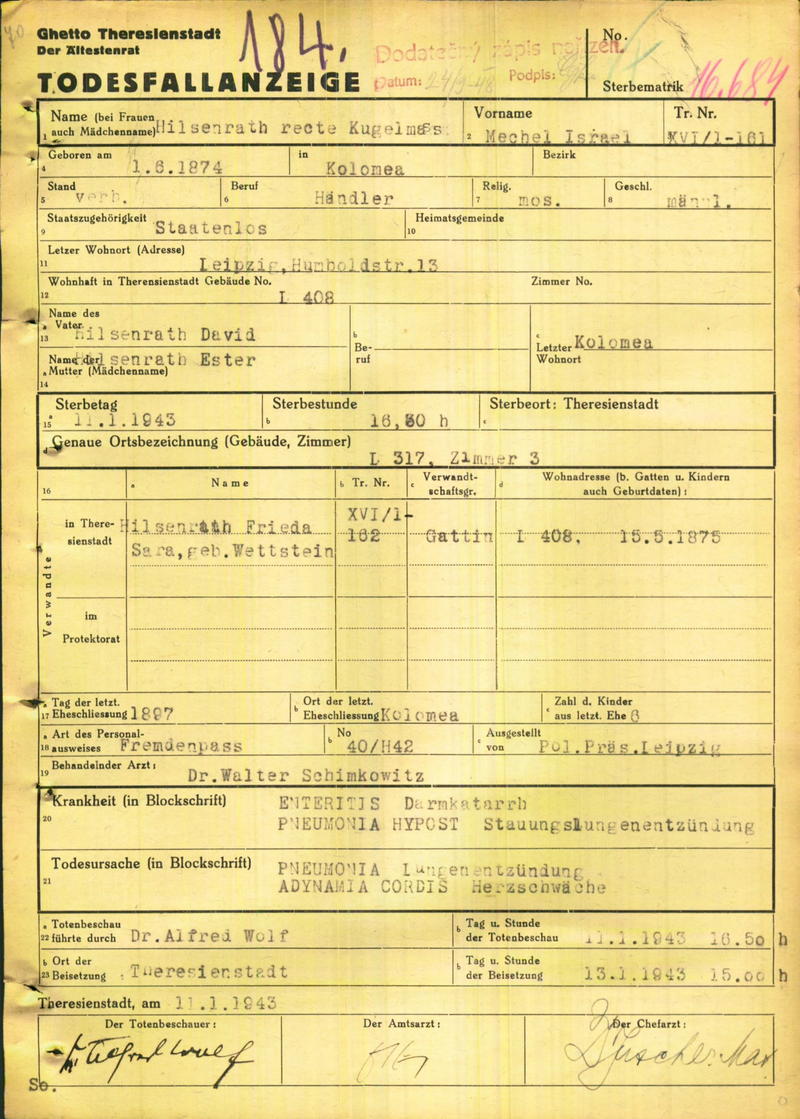 Hilsenrath Mechel: Oznámení o úmrtí, ghetto Terezín