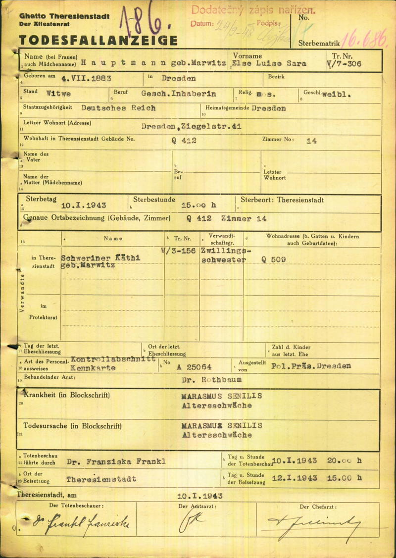 Hauptmann Elsa Luise: Oznámení o úmrtí, ghetto Terezín