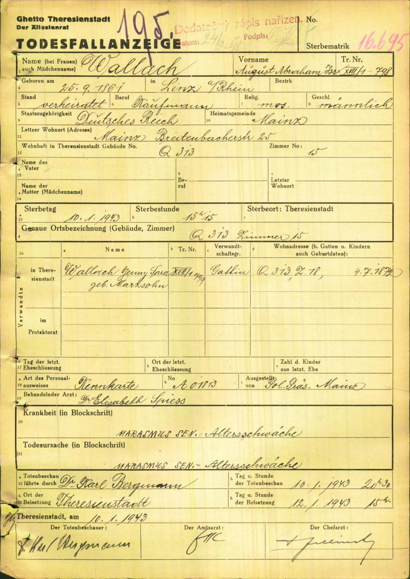 Wallach August: Oznámení o úmrtí, ghetto Terezín