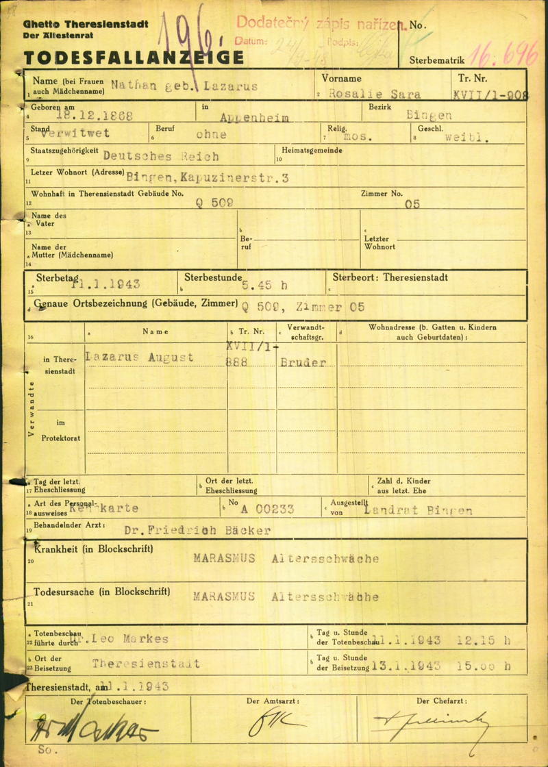 Nathan Rosalie: Oznámení o úmrtí, ghetto Terezín