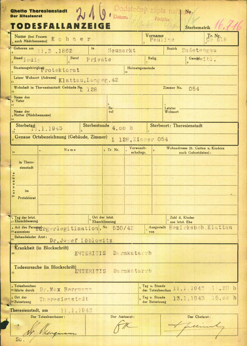 Kohnerová Pavlína: Oznámení o úmrtí, ghetto Terezín