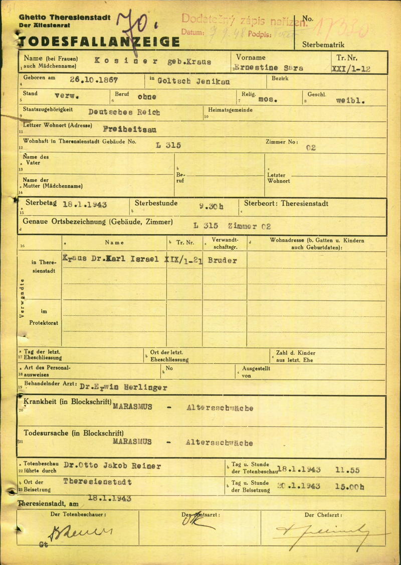 Kosinerová Arnoštka: Oznámení o úmrtí, ghetto Terezín