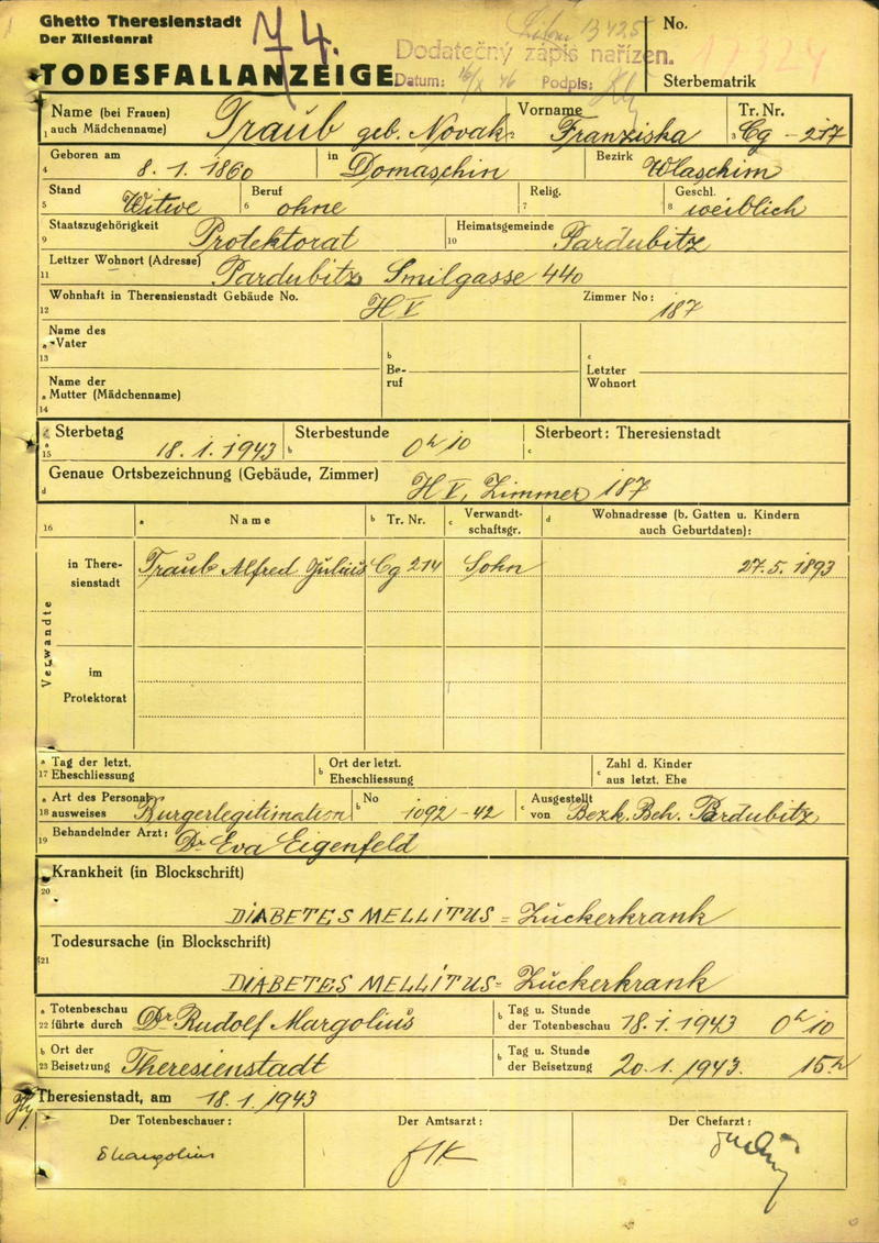 Traubová Františka: Oznámení o úmrtí, ghetto Terezín