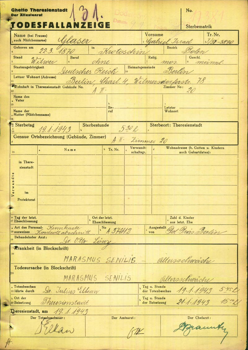 Glaser Gabriel: Oznámení o úmrtí, ghetto Terezín