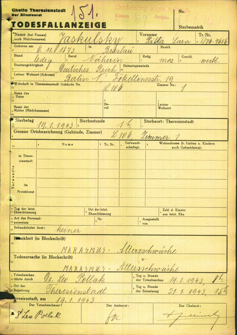 Jaskulsky Sophie Zilla: Oznámení o úmrtí, ghetto Terezín