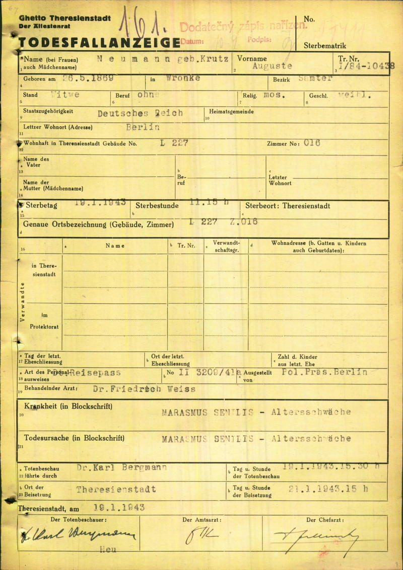 Neumann Auguste: Oznámení o úmrtí, ghetto Terezín