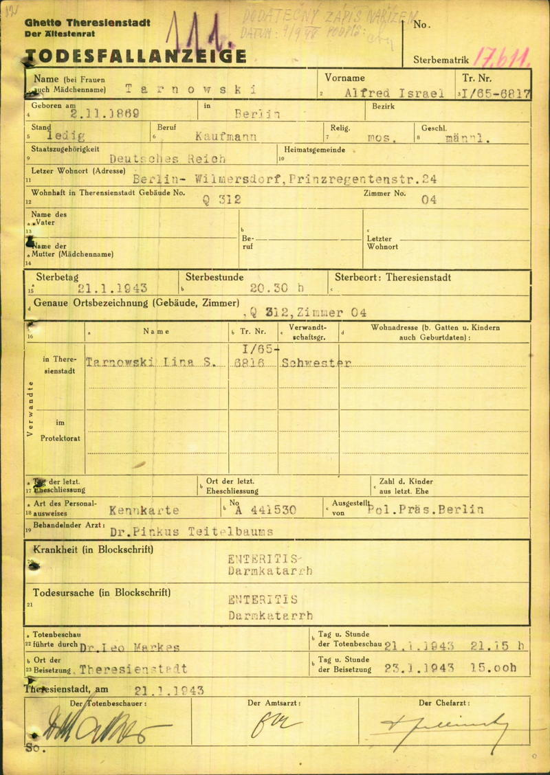 Tarnowski Alfred: Oznámení o úmrtí, ghetto Terezín