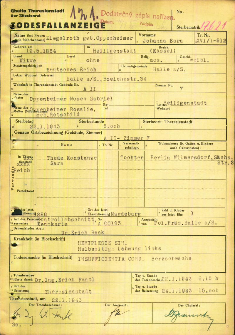 Ziegelroth Johanna: Oznámení o úmrtí, ghetto Terezín