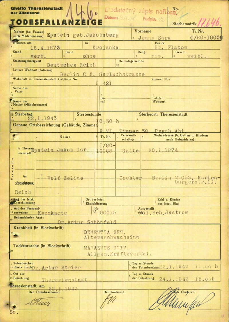 Epstein Jenny: Oznámení o úmrtí, ghetto Terezín
