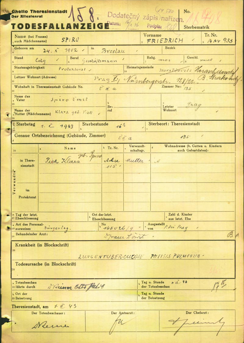 Spiro Friedrich: Oznámení o úmrtí, ghetto Terezín