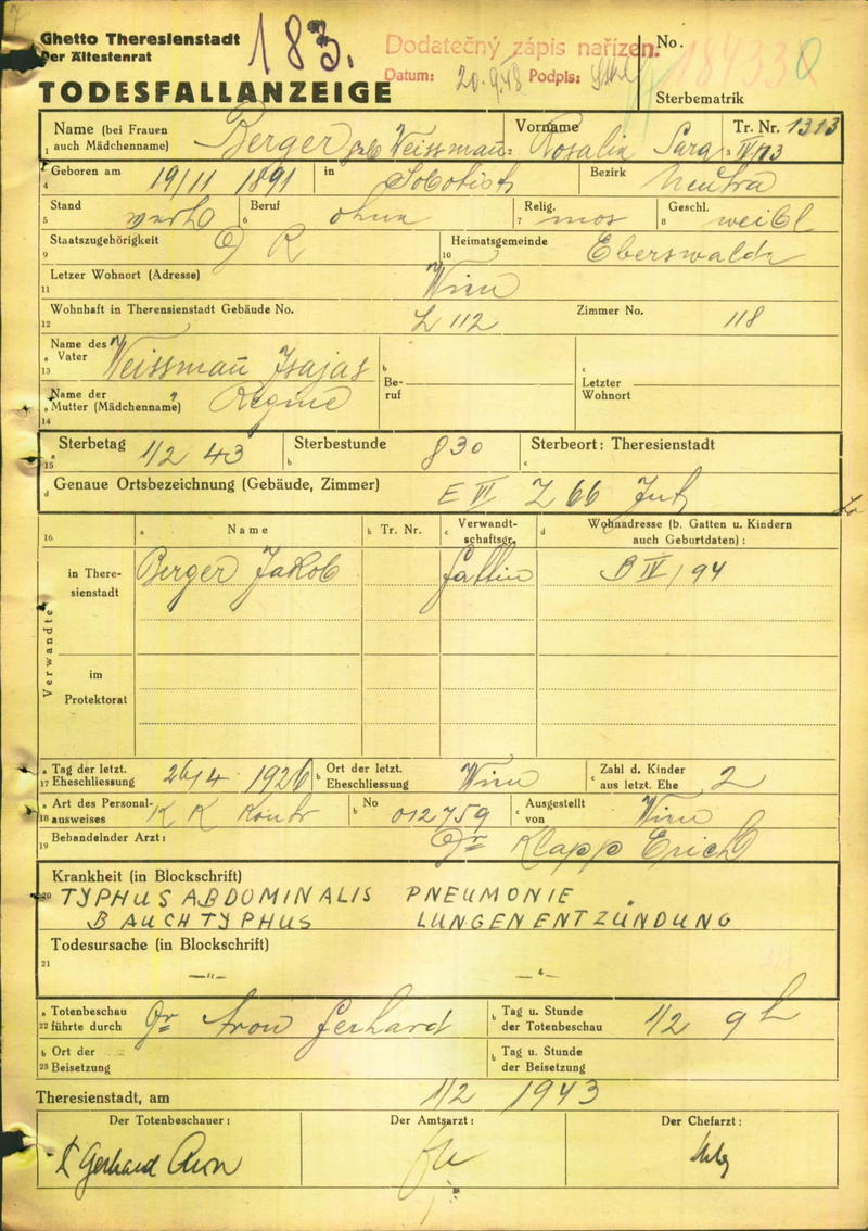 Berger Rosalie: Oznámení o úmrtí, ghetto Terezín