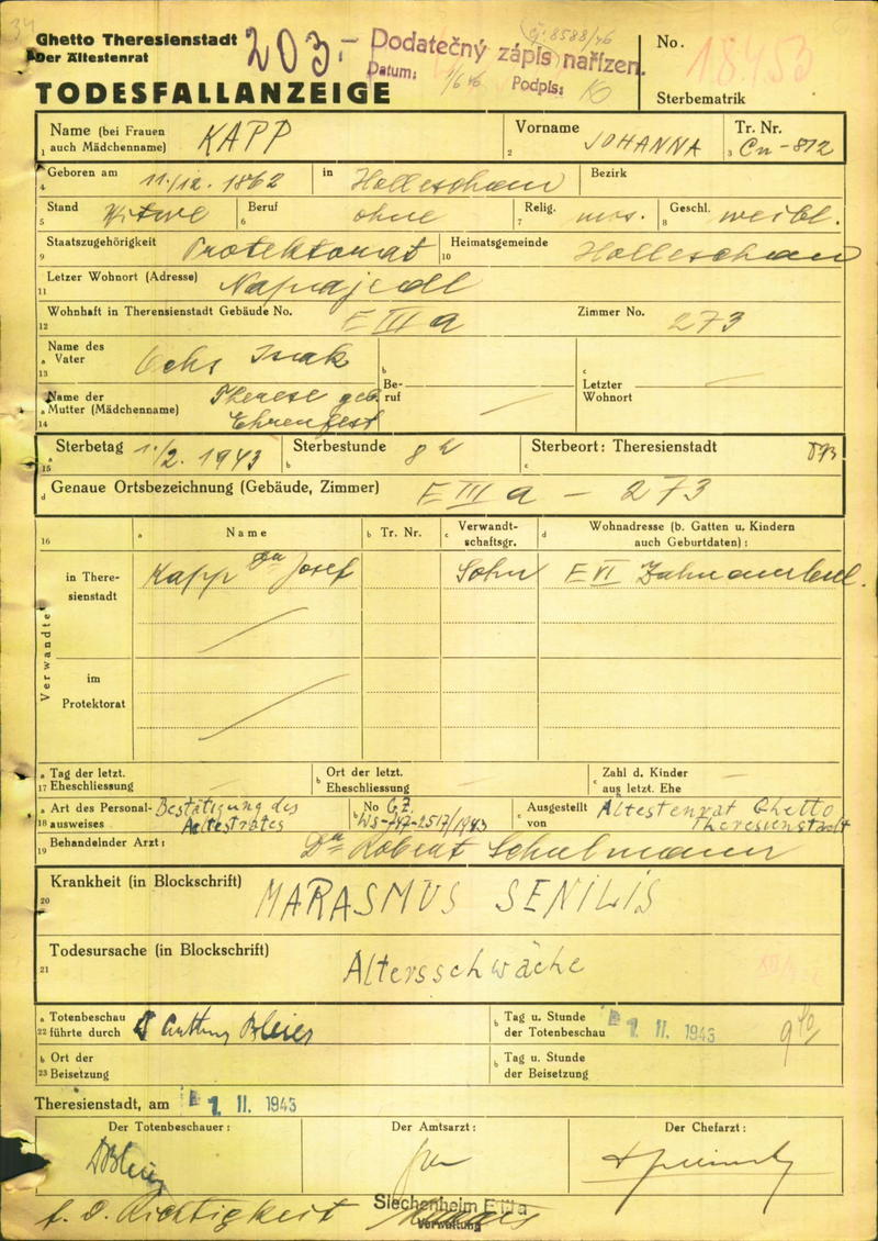 Kappová Johanna: Oznámení o úmrtí, ghetto Terezín