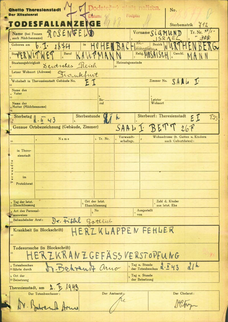 Rosenfeld Sigmund: Oznámení o úmrtí, ghetto Terezín