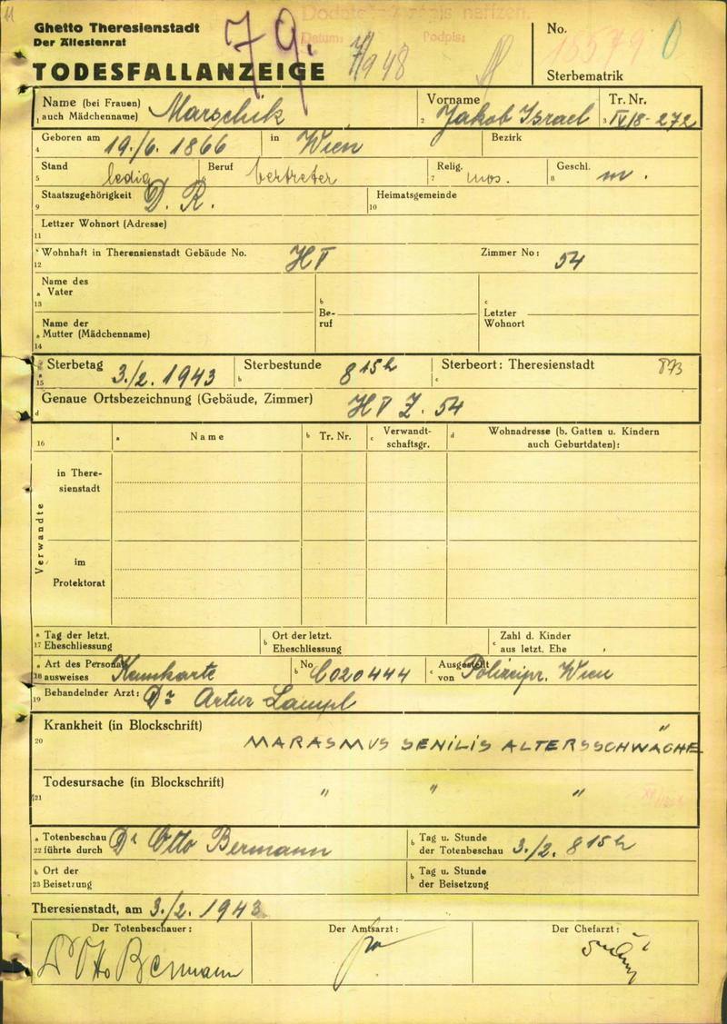 Marschik Jakob: Oznámení o úmrtí, ghetto Terezín