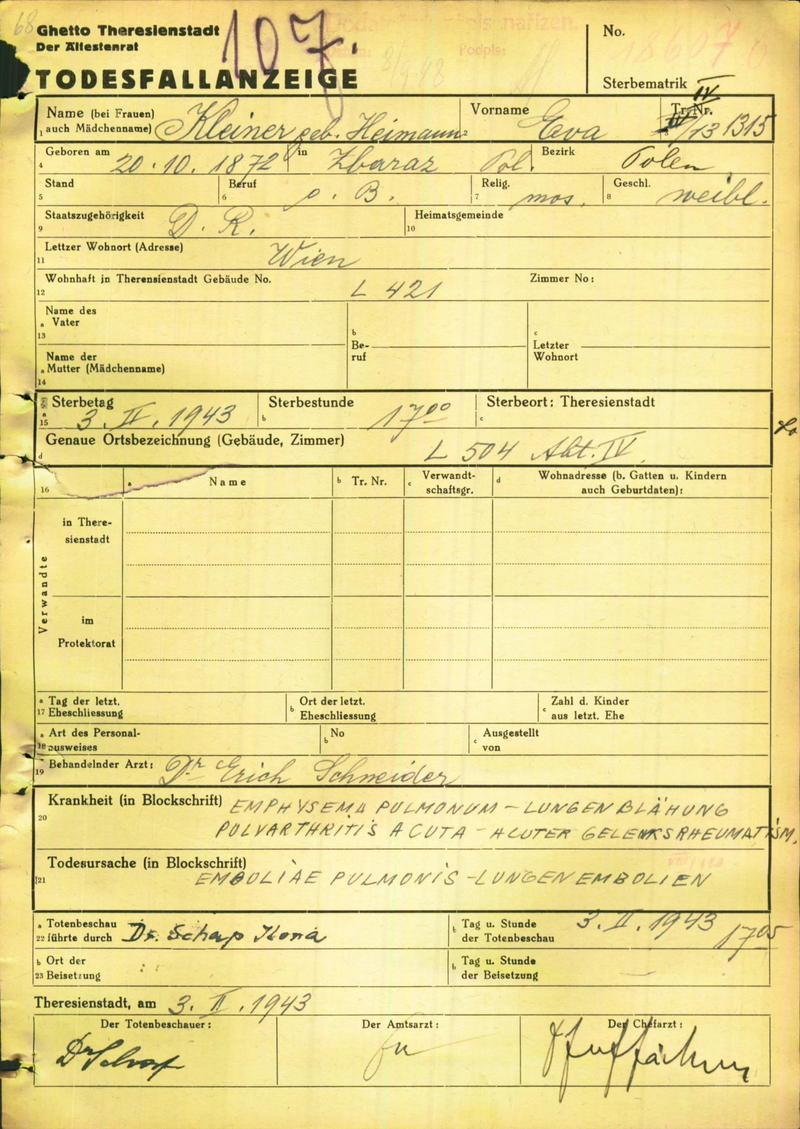 Kleiner Eva: Oznámení o úmrtí, ghetto Terezín