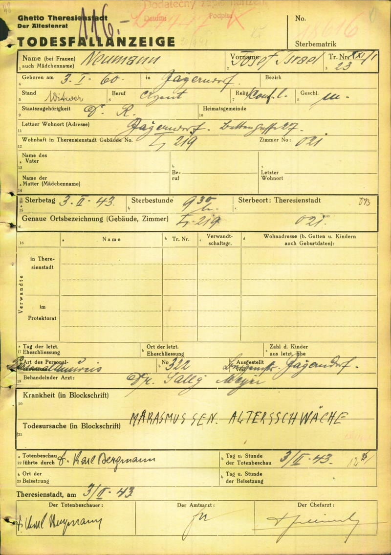 Neumann Josef: Oznámení o úmrtí, ghetto Terezín