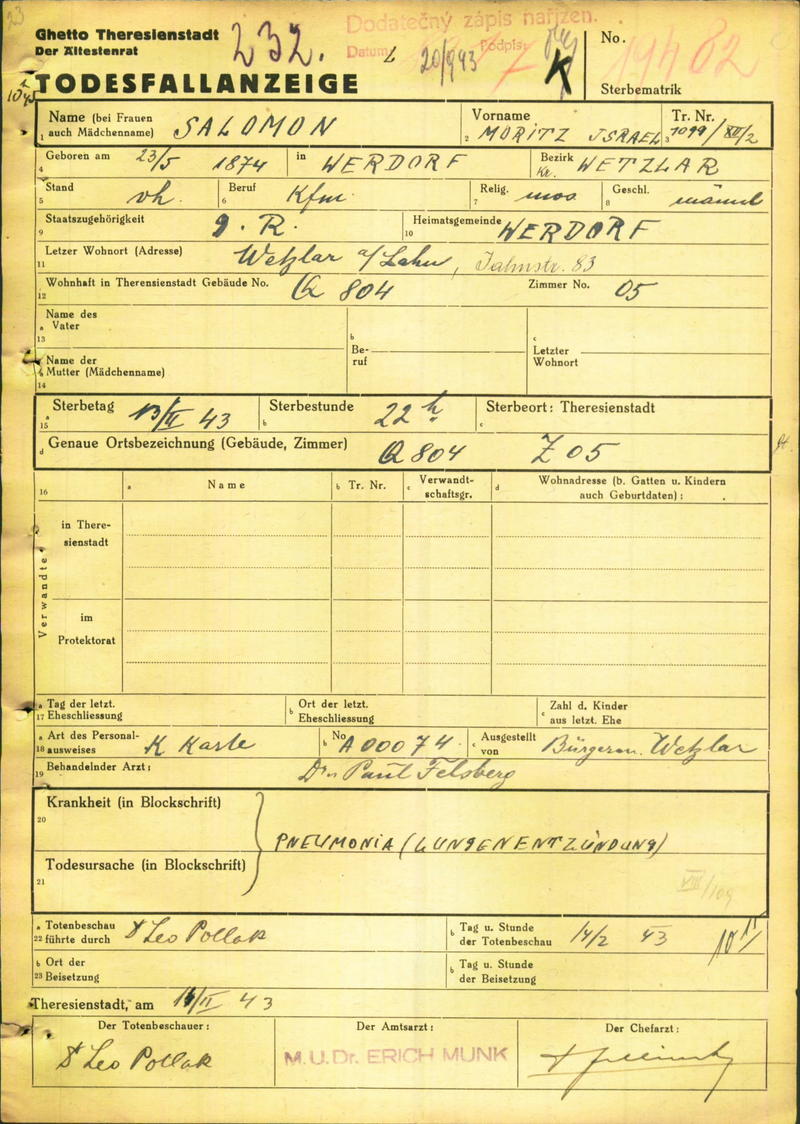 Salomon Moritz: Oznámení o úmrtí, ghetto Terezín