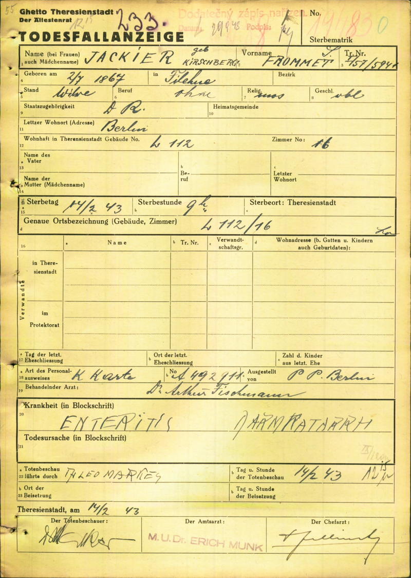 Jackier Flora: Oznámení o úmrtí, ghetto Terezín