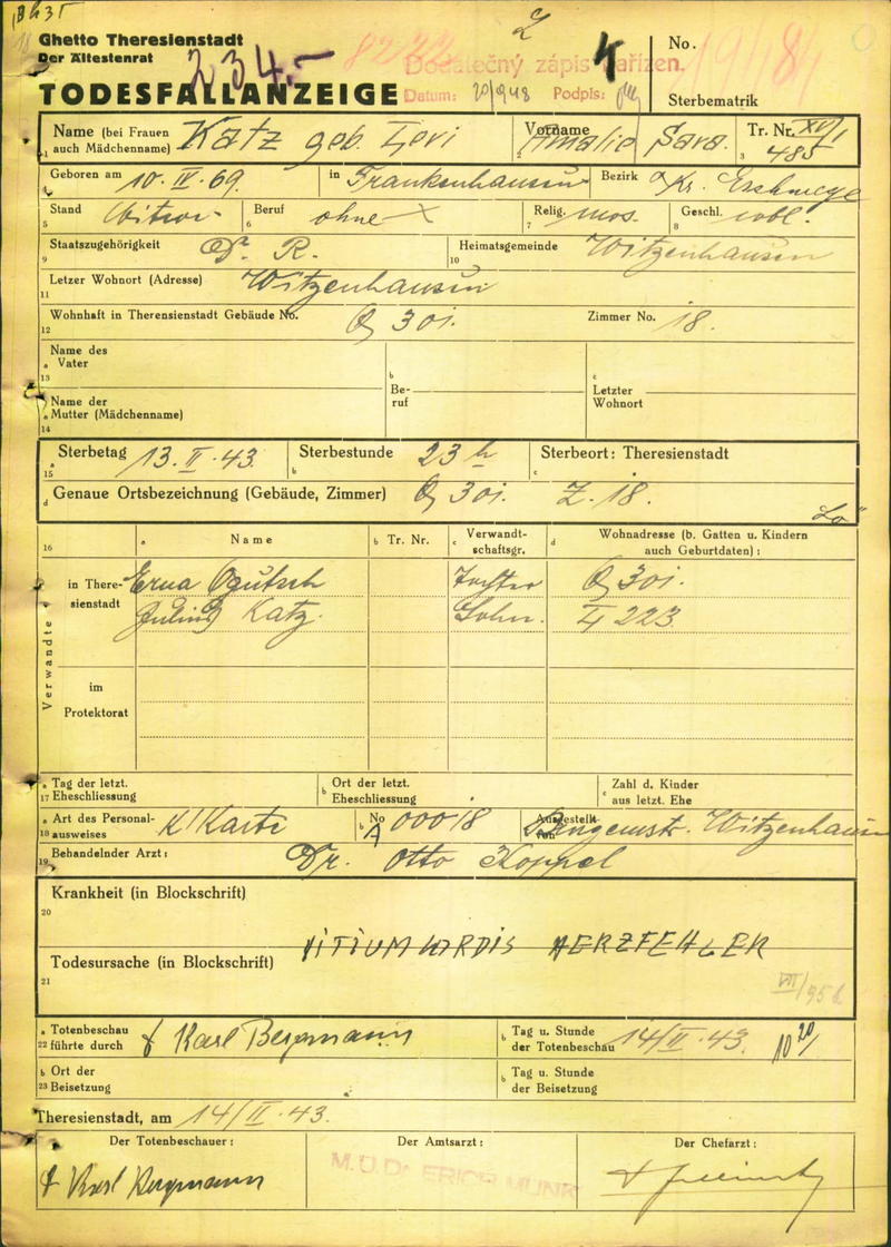 Katz Amalie: Oznámení o úmrtí, ghetto Terezín