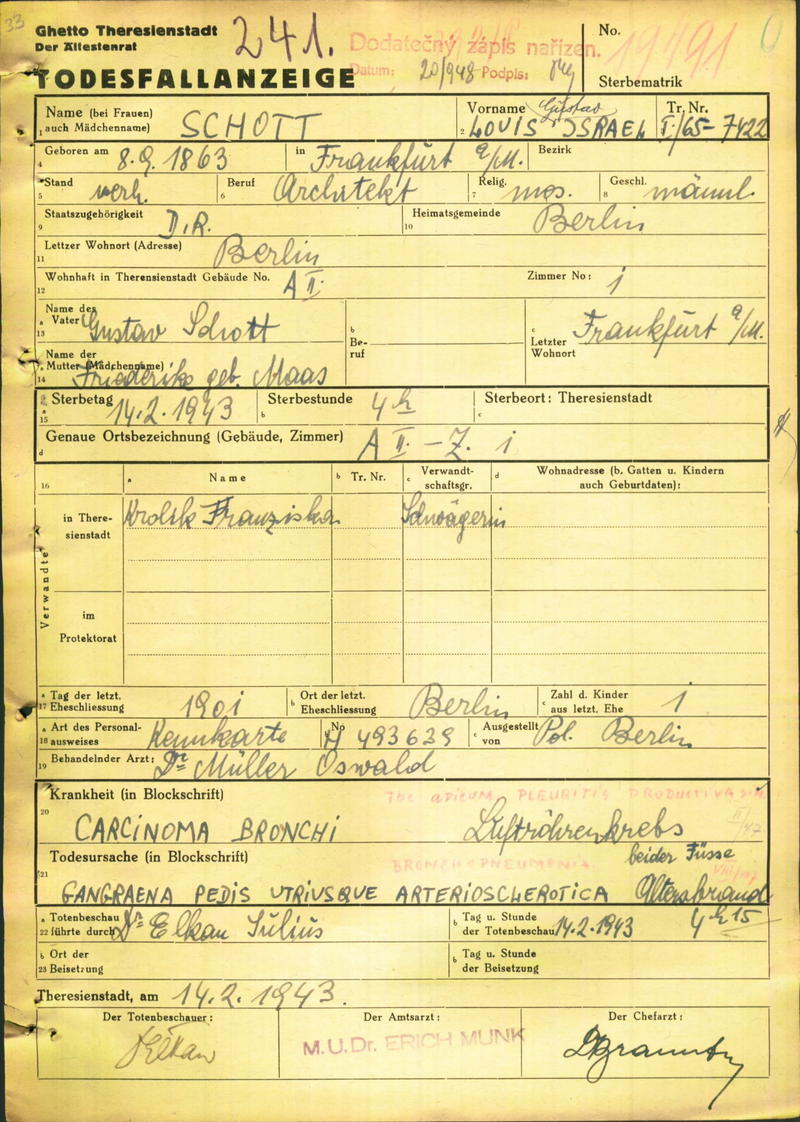 Schott Louis Gustav: Oznámení o úmrtí, ghetto Terezín