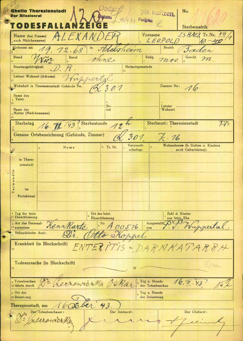 Alexander Leopold: Oznámení o úmrtí, ghetto Terezín