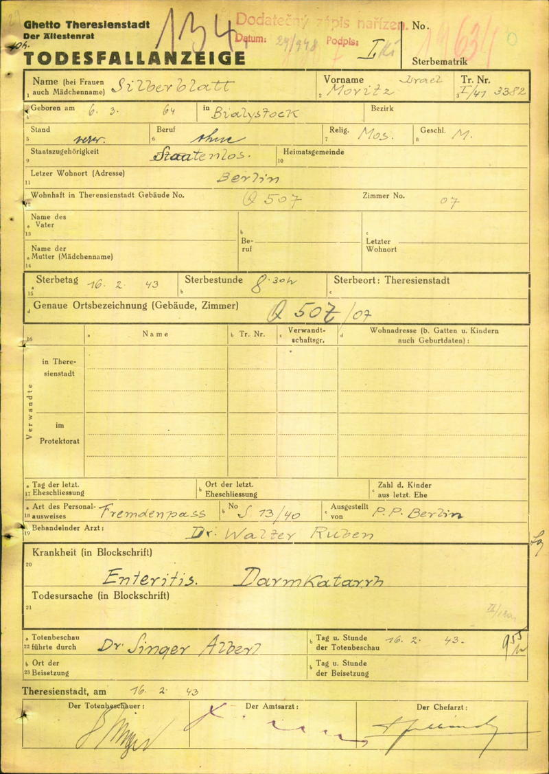 Silberblatt Moritz: Oznámení o úmrtí, ghetto Terezín