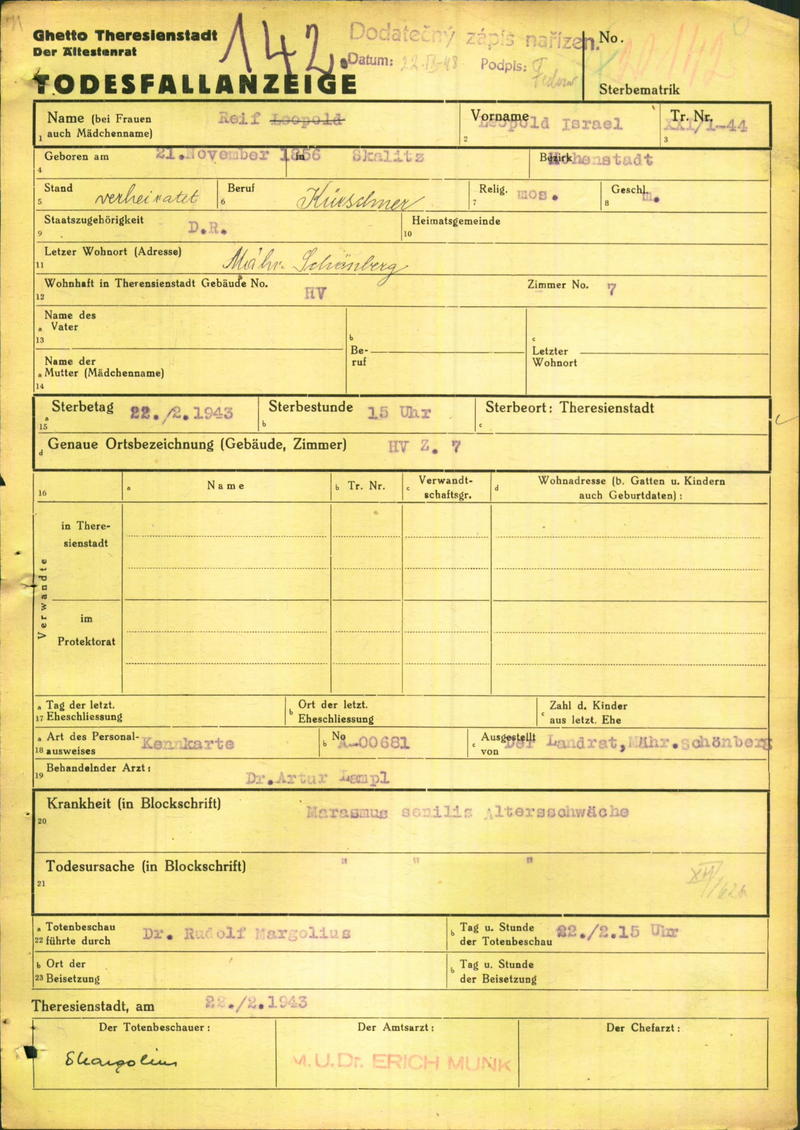Reif Leopold: Oznámení o úmrtí, ghetto Terezín