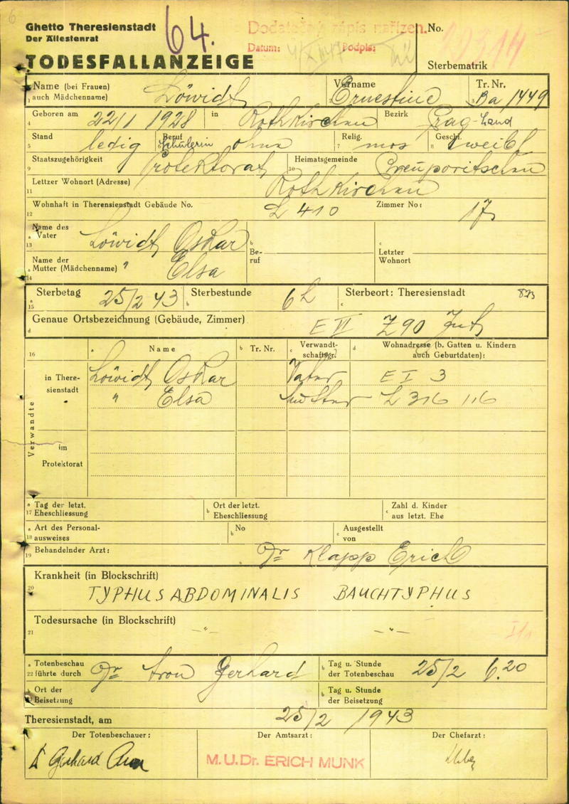 Löwidtová Arnoštka: Oznámení o úmrtí, ghetto Terezín