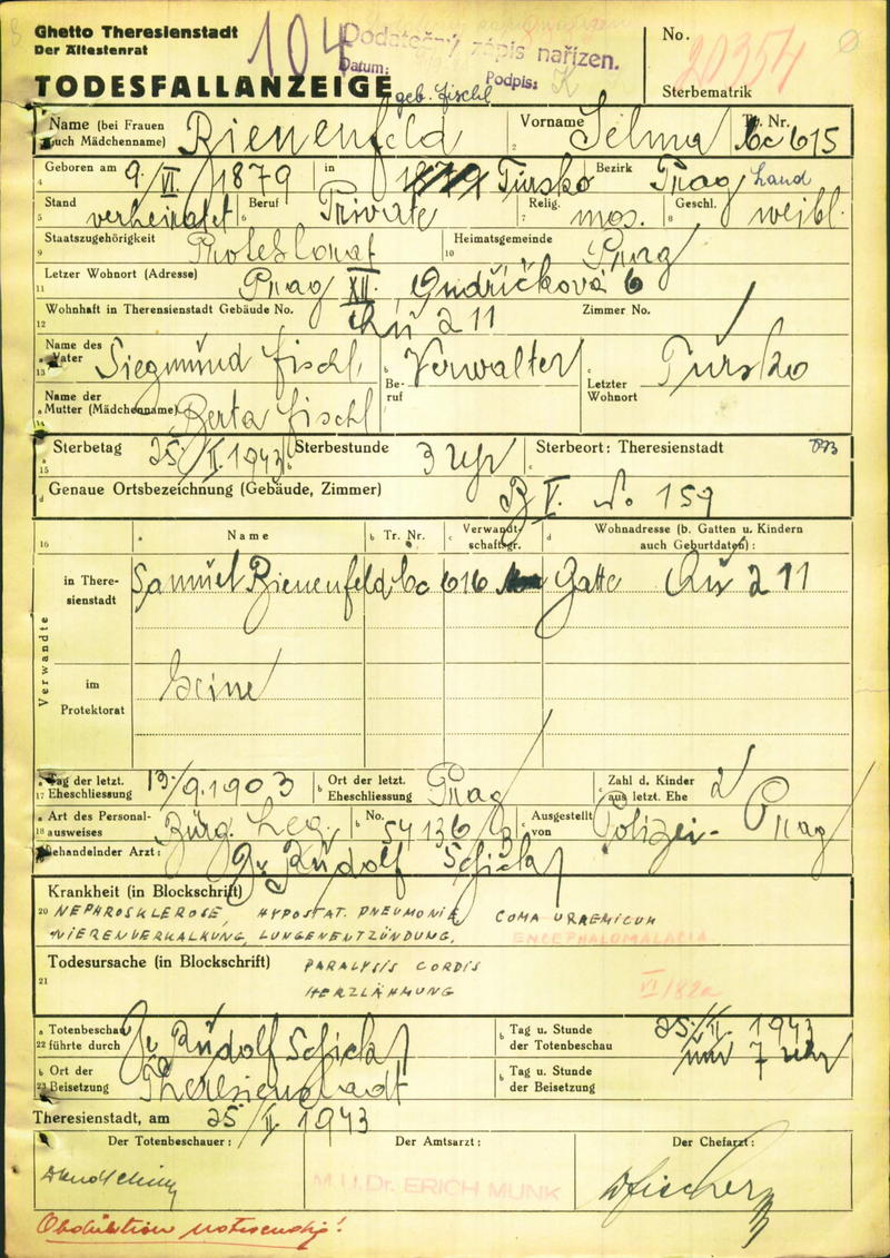 Bienenfeldová Selma: Oznámení o úmrtí, ghetto Terezín