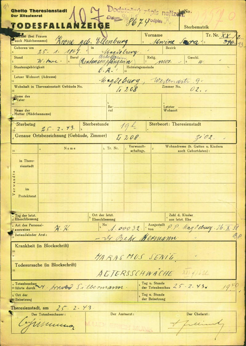 Krone Alwine: Oznámení o úmrtí, ghetto Terezín
