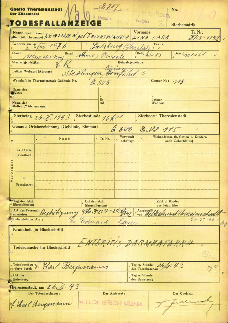 Lehmann Lina: Oznámení o úmrtí, ghetto Terezín