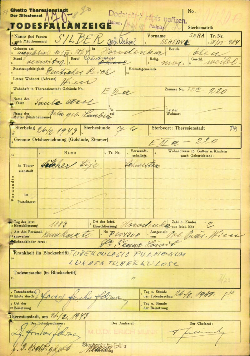 Silber Schewe: Oznámení o úmrtí, ghetto Terezín
