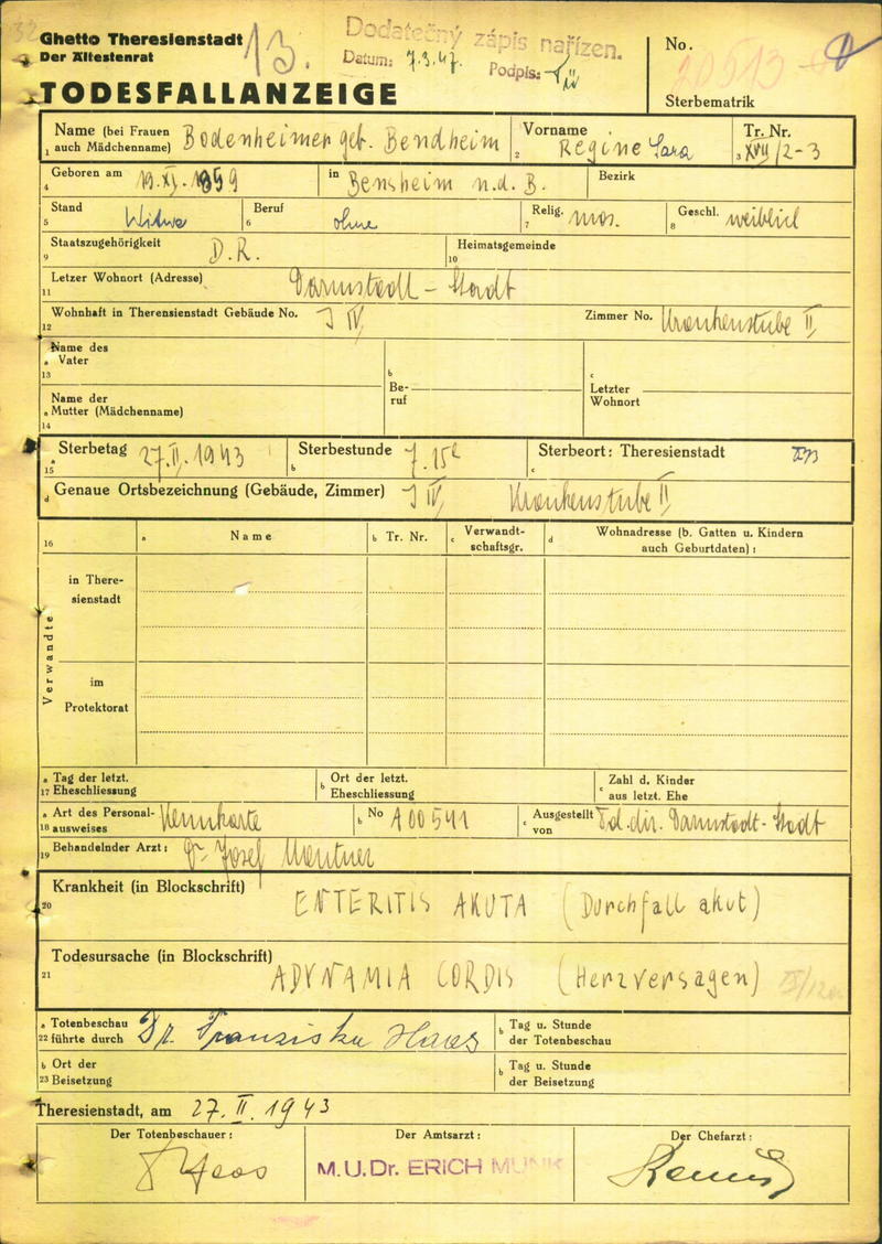 Bodenheimer Regine: Oznámení o úmrtí, ghetto Terezín