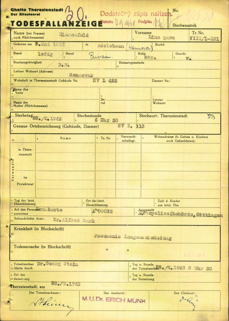 Blumenfeld Lina: Oznámení o úmrtí, ghetto Terezín