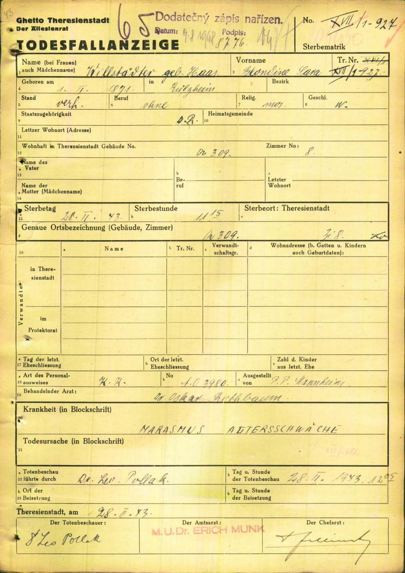 Willstetter Blondine: Oznámení o úmrtí, ghetto Terezín