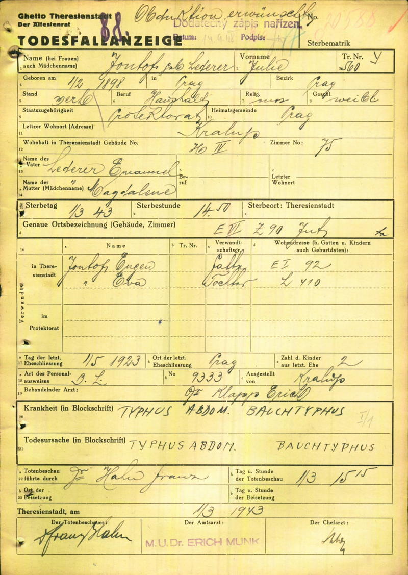 Jontofová Julie: Oznámení o úmrtí, ghetto Terezín