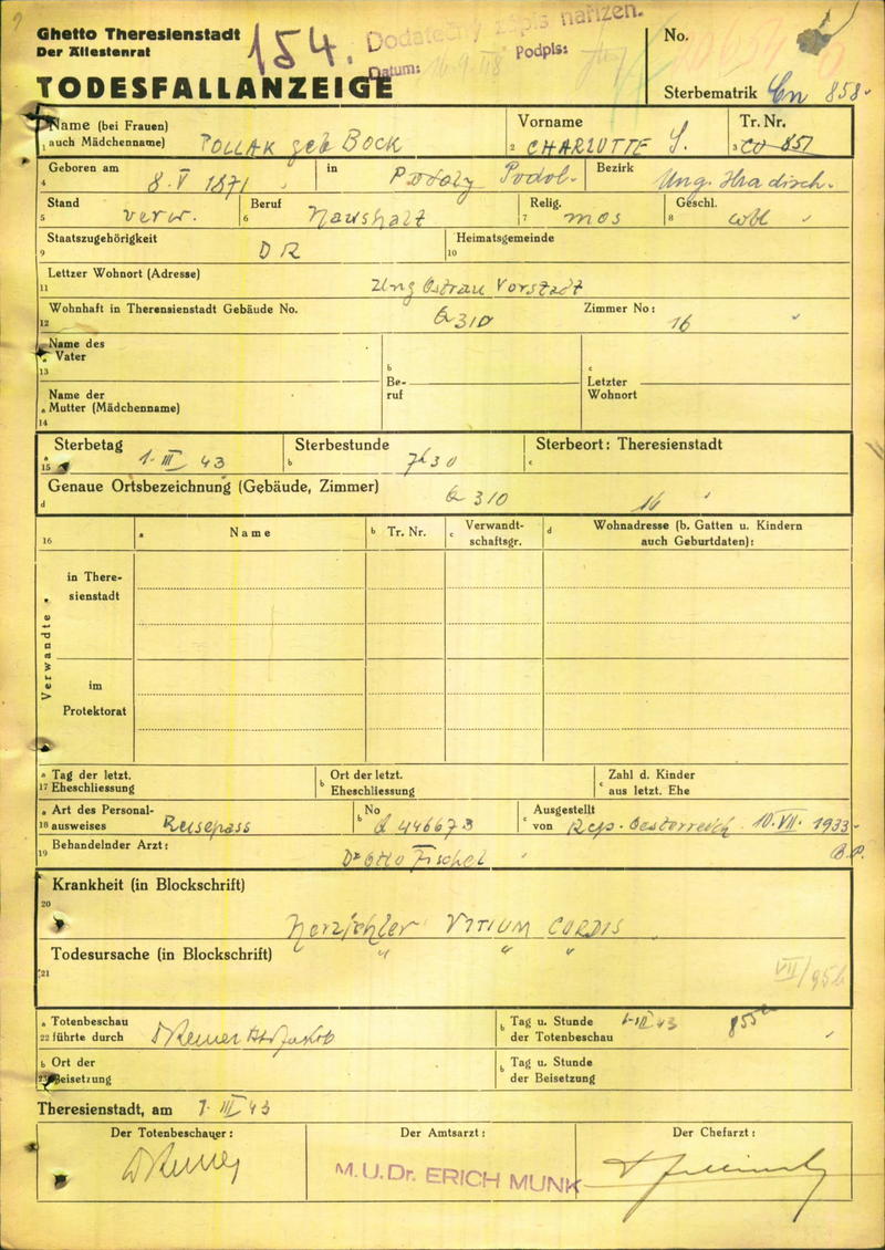 Pollaková Charlota: Oznámení o úmrtí, ghetto Terezín