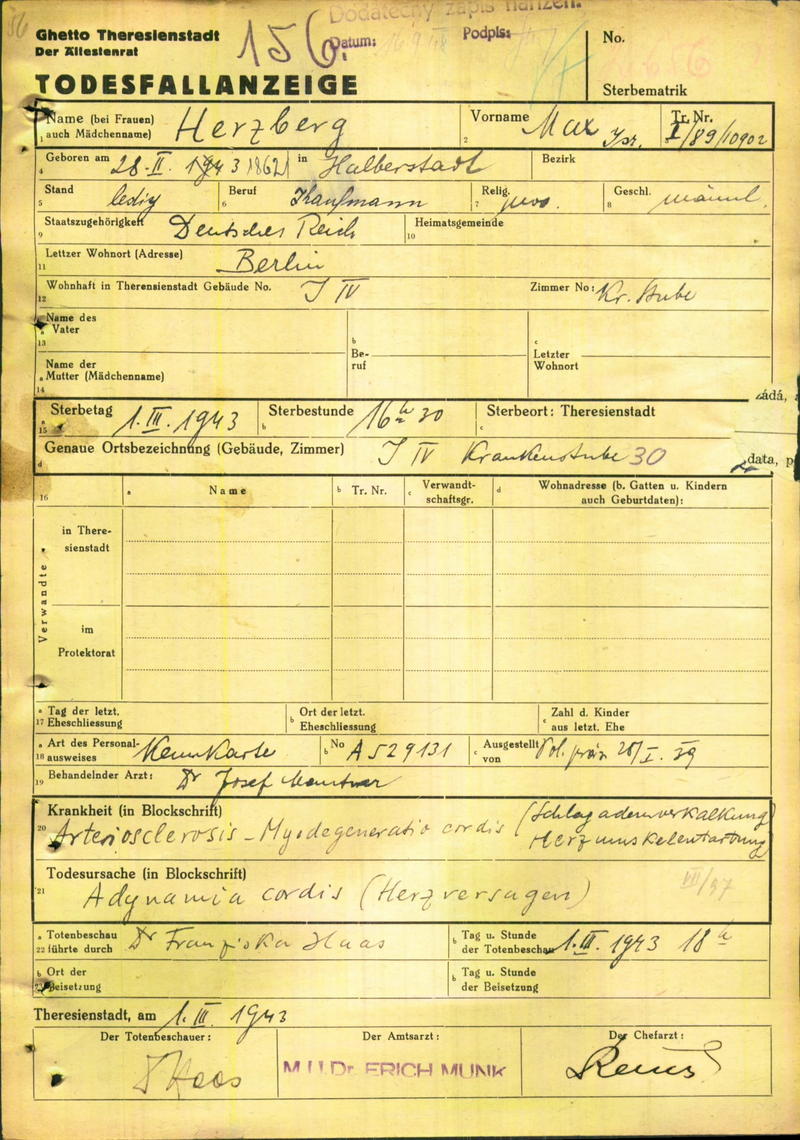 Herzberg Max: Oznámení o úmrtí, ghetto Terezín