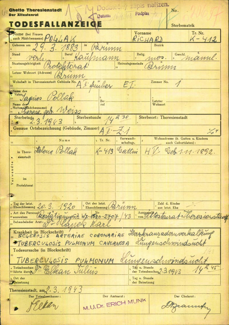 Pollak Richard: Oznámení o úmrtí, ghetto Terezín