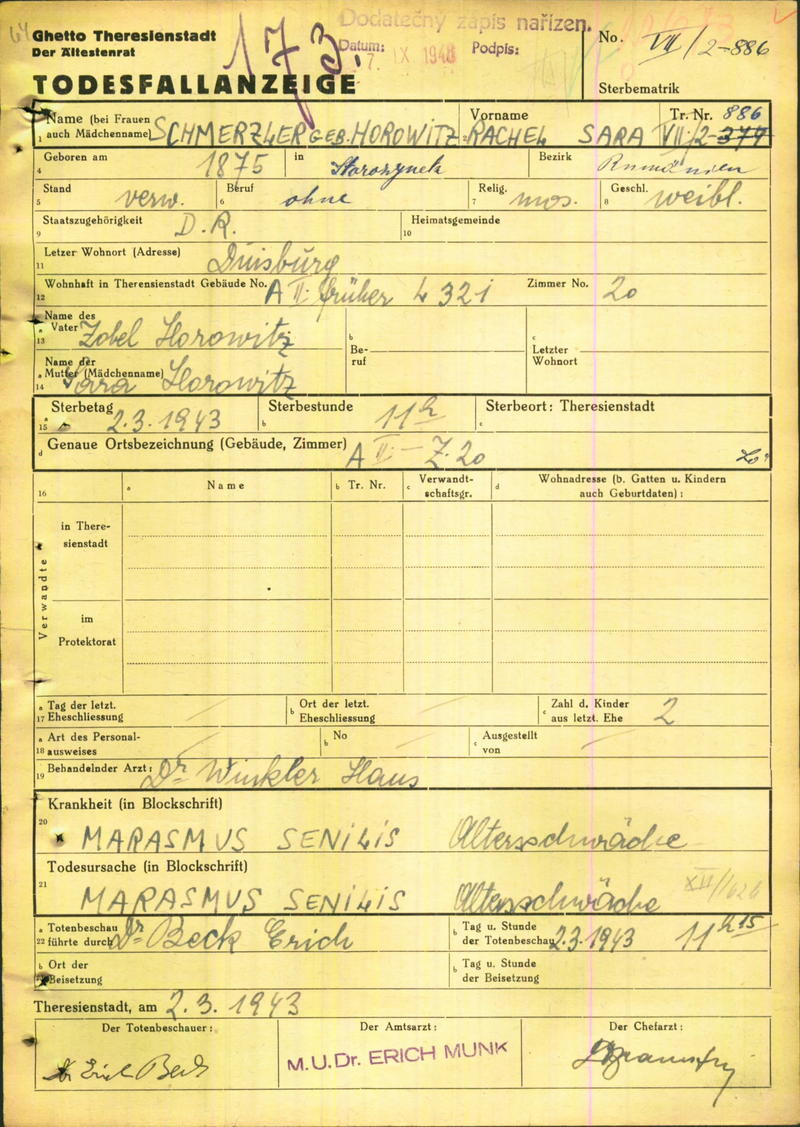 Schmerzler Rachel: Oznámení o úmrtí, ghetto Terezín