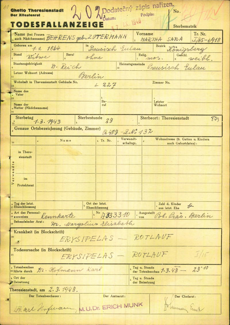 Behrens Martha: Oznámení o úmrtí, ghetto Terezín