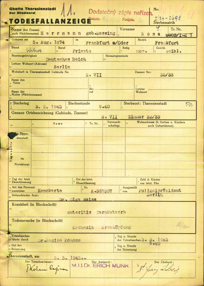Herrmann Rosa: Oznámení o úmrtí, ghetto Terezín