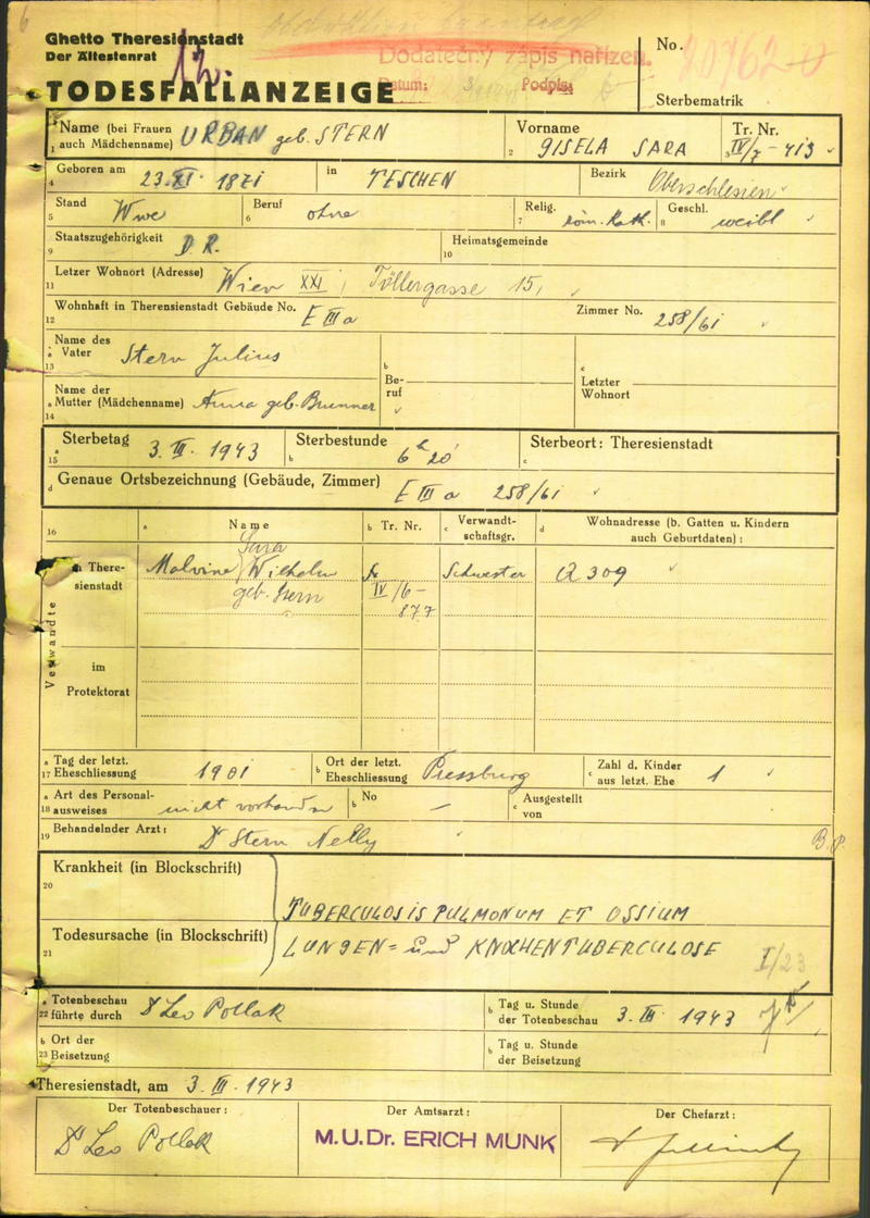 Urban Gisela: Oznámení o úmrtí, ghetto Terezín