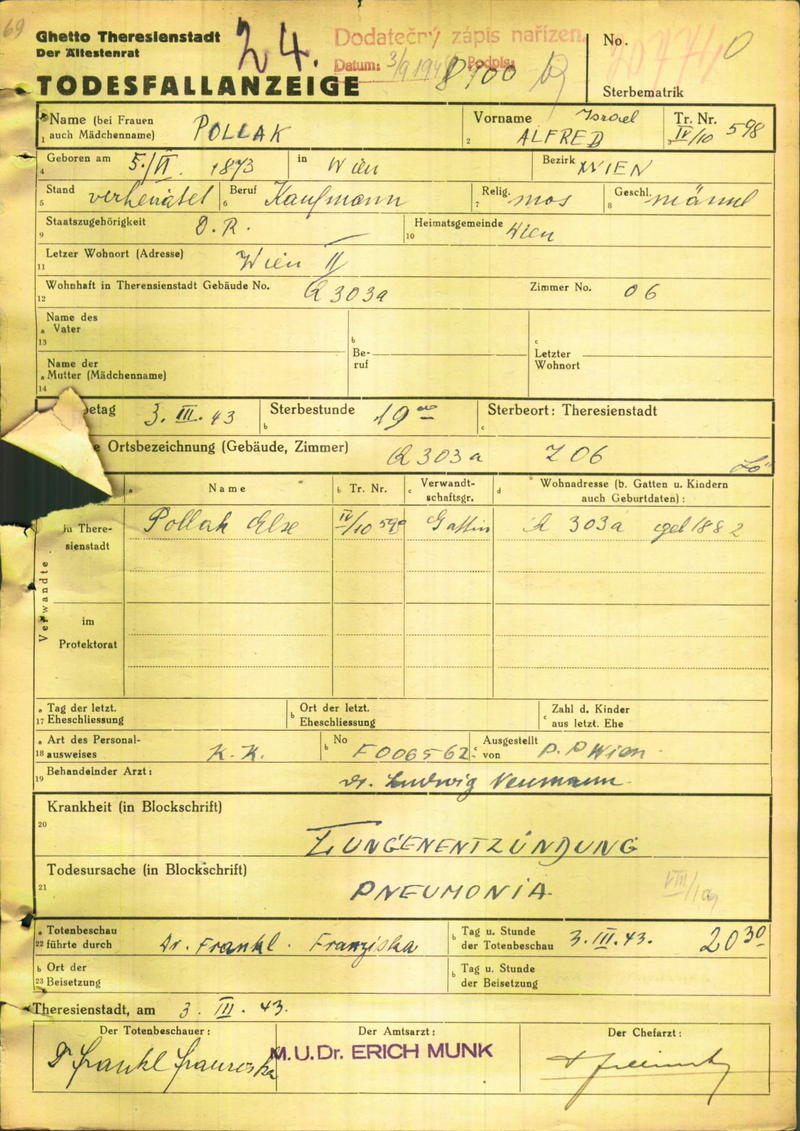 Pollak Alfred: Oznámení o úmrtí, ghetto Terezín